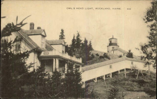 Above is Owls Head Lighthouse in Maine. In 1903 a 60-foot covered way was built between the lighthouse and the oilhouse. Three years later another walkway connected to the first and provided a weather-free link between the keeper's quarters, the light tower, and the oilhouse. The keeper, if he so desired, could tend the lighthouse in pajamas, though I doubt any ever did. The covered way simply made access easier and safer. The keeper still had to trek outside to work the fogbell. Owls Head's covered way is gone today.